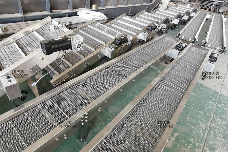 (3)鋼絲網(wǎng)帶 鋼絲網(wǎng)帶強度高,耐高溫。它具有網(wǎng)孔,網(wǎng)孔的大小可按需要選擇,多用于一邊輸送一邊固液分離的場合。如油炸食品爐中的物料輸送,水果洗滌設(shè)備中的水平輸送等常采用鋼絲網(wǎng)帶。鋼絲網(wǎng)帶用于烘烤食品設(shè)備中時,由于網(wǎng)帶網(wǎng)孔能透氣,故烘烤時食品生坯底部水分容易蒸發(fā),其外形不會因脹發(fā)而變得不規(guī)則或發(fā)生油灘、洼底、粘帶及打滑等現(xiàn)象。網(wǎng)帶上積累的面屑碳黑不易清洗,致使制品底部粘上黑斑而影響食品質(zhì)量。應對網(wǎng)帶涂鍍防粘材料來解決。