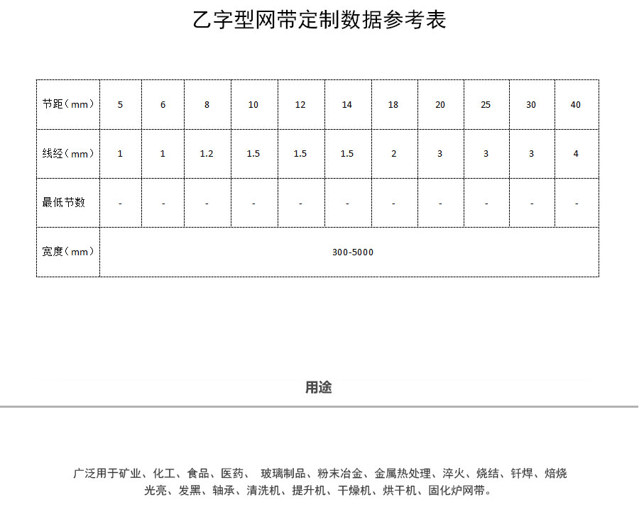 乙字型網(wǎng)帶簡介:乙字型網(wǎng)帶又稱乙型網(wǎng)帶、食品網(wǎng)帶、巧克力網(wǎng)帶,節(jié)距分隔一般按用戶要求定制,屬非標準輸送網(wǎng)帶。