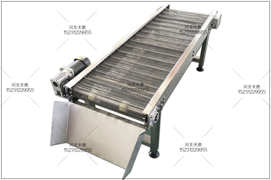 輸送帶的材質采用不銹鋼材質,鋼絲采用1.2毫米直徑進行雙旋編織,孔為10*15毫米,鏈條節距為31.75毫米,鏈桿直徑為6毫米,桿之間的距離為3節一根。