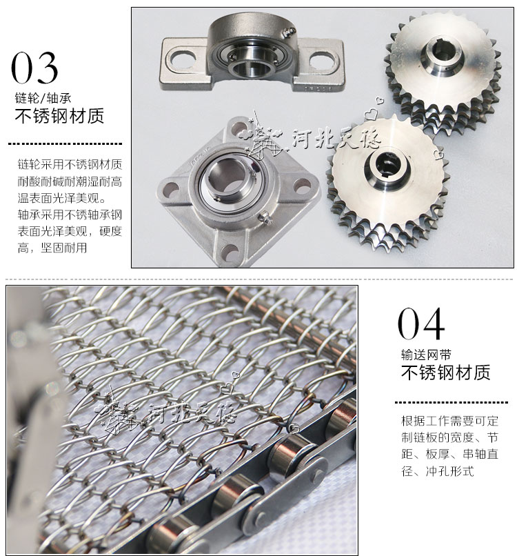 網(wǎng)帶材質(zhì): 碳鋼、201不銹鋼、304不銹鋼(某些帶型符合FDA、USDA標(biāo)準(zhǔn),因此廣泛用于食品加工業(yè)。)