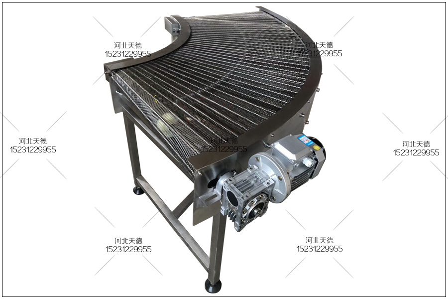 江西撫州客戶定制的轉(zhuǎn)彎網(wǎng)帶輸送機(jī),用來(lái)加工輸送餅干,將生產(chǎn)好的餅干輸送到下一個(gè)工序進(jìn)行包裝,這種輸送機(jī)采用鏈條式轉(zhuǎn)彎輸送帶,輸送帶內(nèi)徑鏈條節(jié)距為31.75毫米,外徑輸送鏈條的節(jié)距為50.8毫米,轉(zhuǎn)彎網(wǎng)帶輸送機(jī)采用不銹鋼304耐高溫耐腐蝕材質(zhì)板材進(jìn)行加工,能在水里或者高溫情況下長(zhǎng)期使用。
