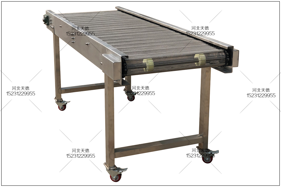 該不銹鋼輸送機總長為1.5米,總寬度為500毫米,高度為60公分,采用鏈條式不銹鋼輸送帶來傳送物品,采用1.2鋼絲編織的10*20的孔,鏈條節(jié)距采用31.75毫米,使用直徑6毫米的串桿來支撐物料的輸送。大概120毫米左右一個串桿。